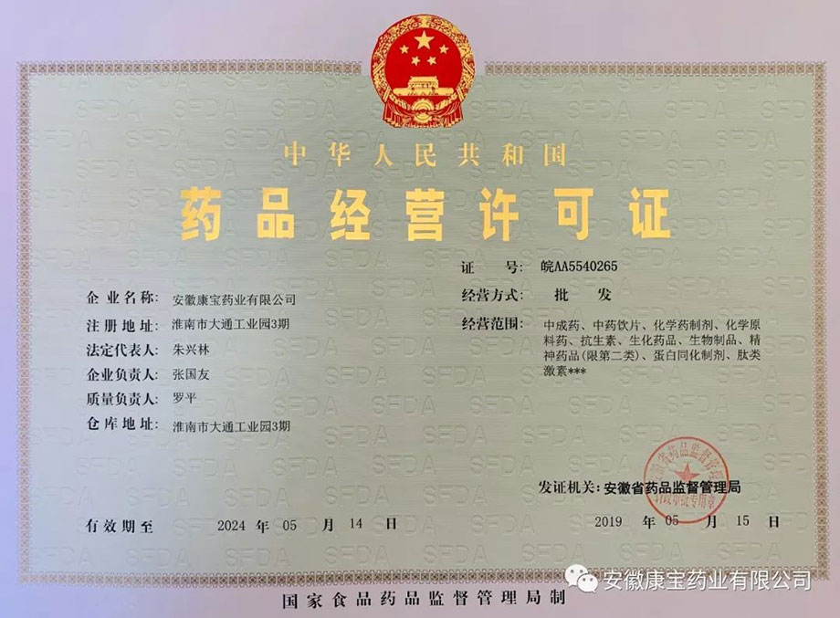 2019年5月23日,安徽省藥品監(jiān)督管理局正式將重新認證后的《藥品經(jīng)營質(zhì)量管理規(guī)范認證證書》、《藥品經(jīng)營許可證》頒發(fā)給康寶藥業(yè),標志著我公司順利通過此次GSP認證檢查。